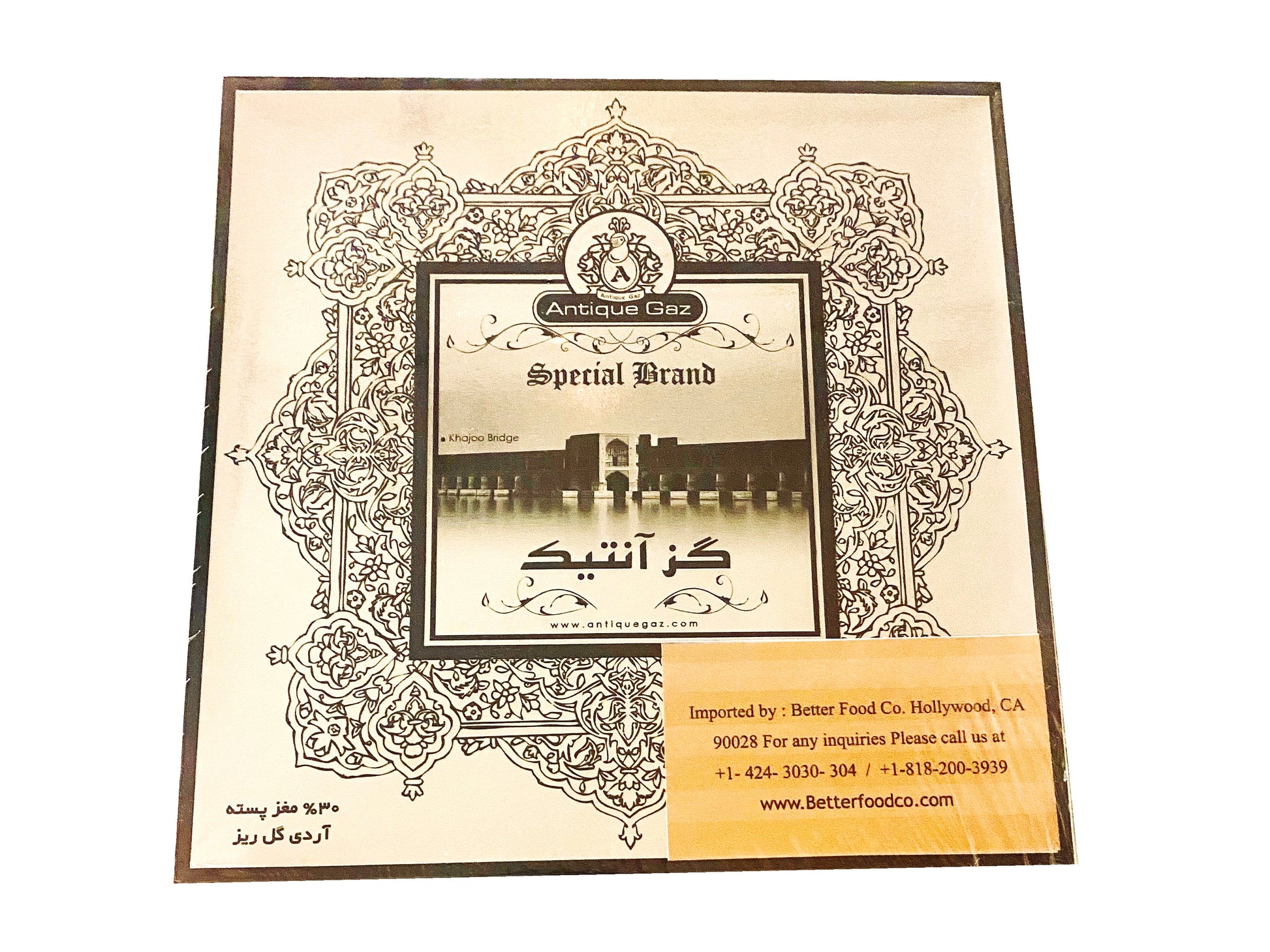 Gaz is a Persian Nougat. Gaz has a deliciously chewy texture with a light rose flavor and pistachios covered with white flour.