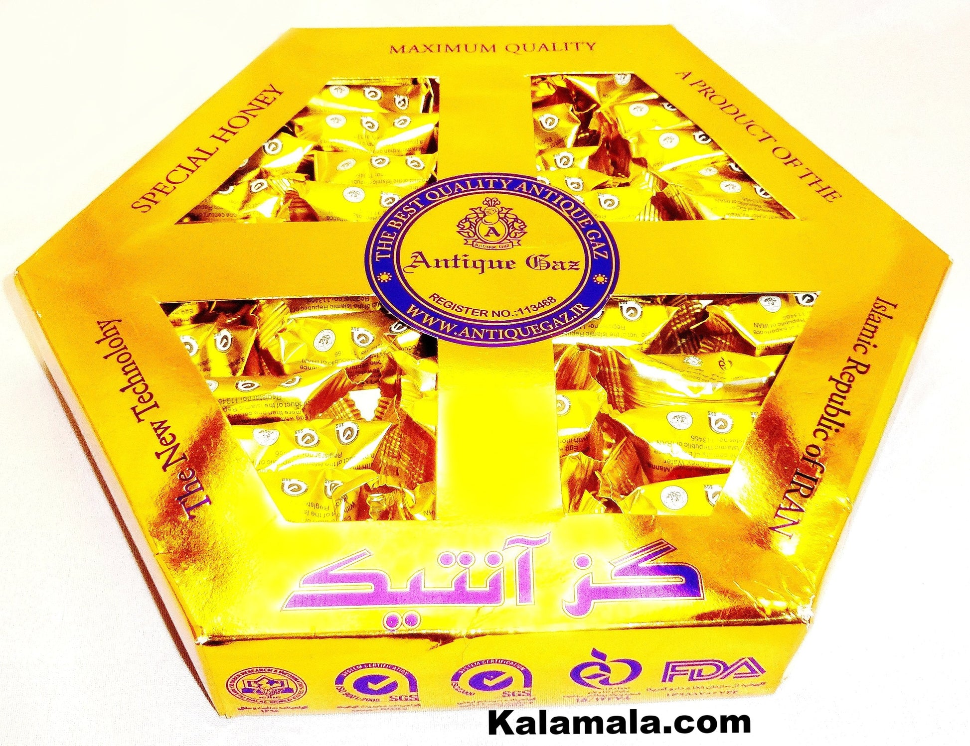 Gaz isa Persian Nougat. Gaz has a delicious chewy texture with a light rose flavor and pistachios covered with white flour.