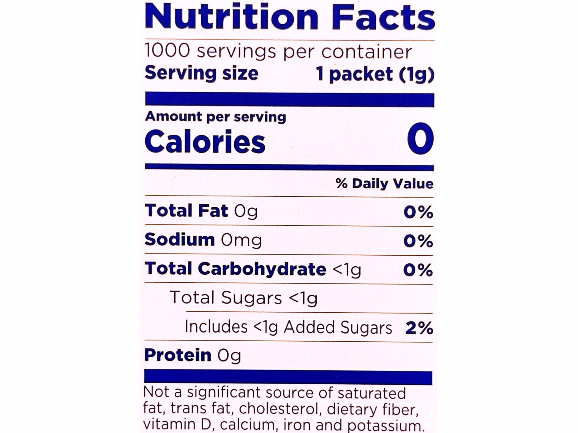 Nutrition Facts Serv. size 1 packet (19), Amount per serving: Calories 0, Total Fat 0g (0% DV), Sodium 0mg (0% DV), Total Carb. <1g (0% DV), Total Sugars sig (Incl. <1g Added Sugars, 2% DV), Protein 0g. Not a significant source of other nutrients. %DV = %Daily Value