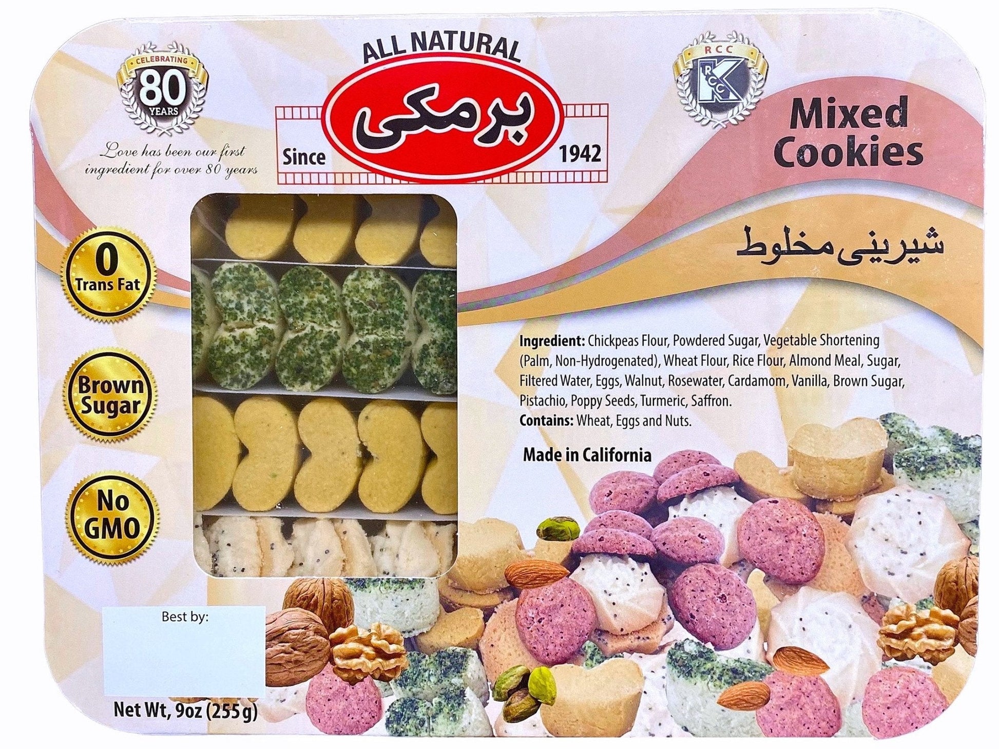 Ingredients: Chickpeas Flour, Powdered Sugar, Vegetable Shortening(Palm, Non-Hydrogenated), Wheat Four, Almond Meal, Sugar, Filtered Water, Eggs, Walnut Rosewater ,Cardamom, Vanilla, Brown Sugar, Pistachio, Poppy seeds, Turmeric, Saffron