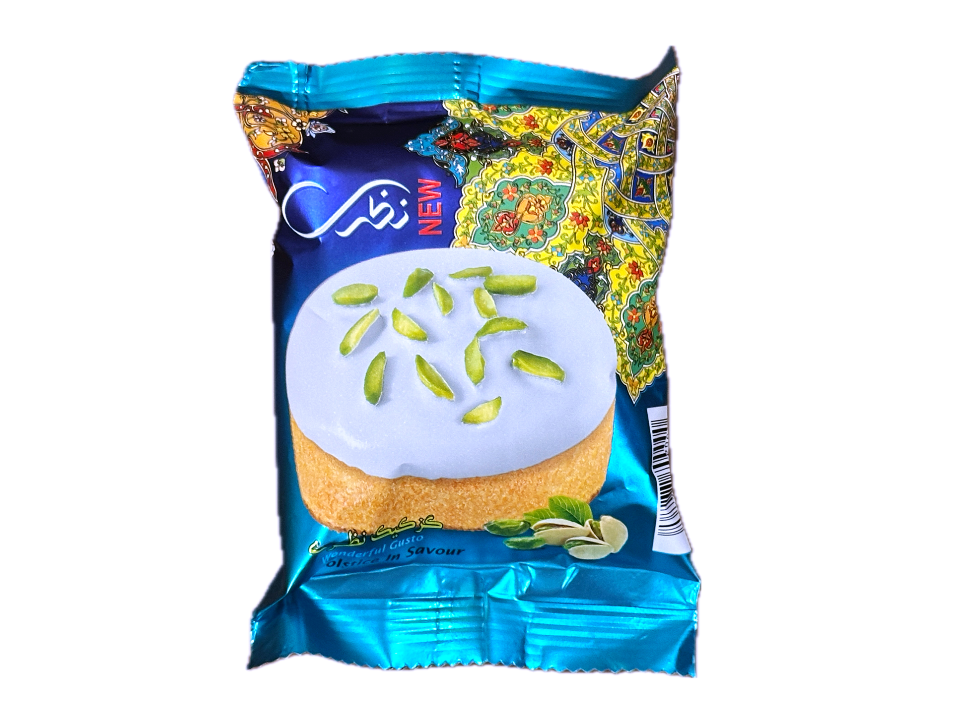 Ingredients: Wheat Flour, Sugar, Egg, Sunflower Oil, shortening Oil, inverted Syrup, Glucose, Sorbitol, baking powder, Gel Cake, Propylene Glycol, Potassium Sorbate, Salt, Cocoa Butter substitute, Gaz, Milk powder, Soya Lecithin, Pistachio, Water