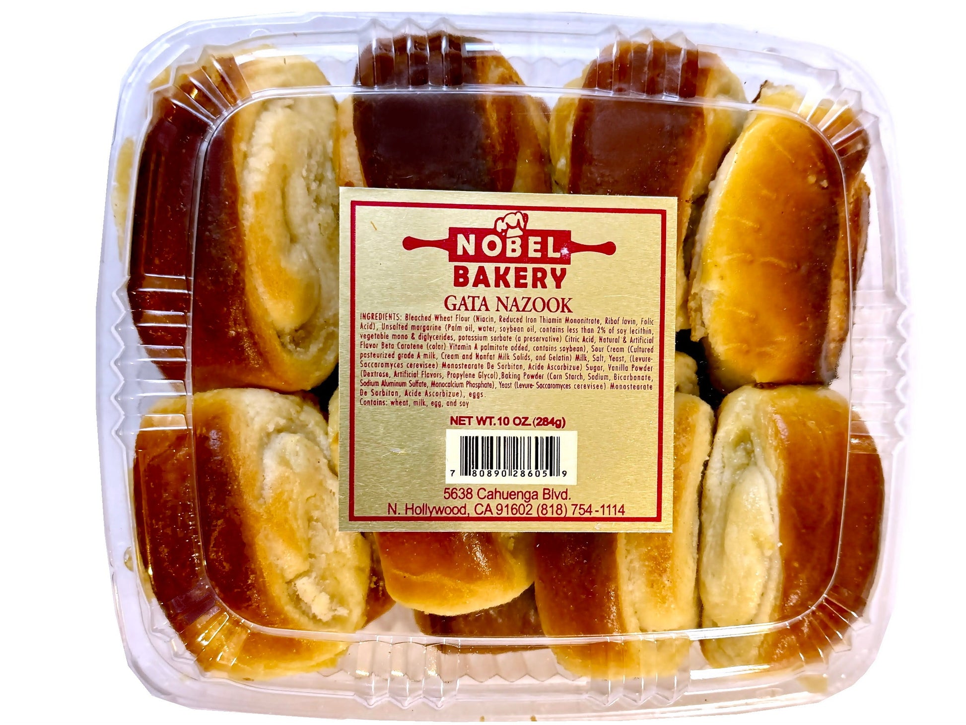 Ingredients: Bleached Wheat Flour (Niacin, Reduced Iron Thiamin Mononitrate,  Riboflavin, Folic Acid),  Unsalted Margarine (Palm Oil, Water, Soybean Oil, Contains less than 2% of soy Lecithin, Vegetable Mono & Diglycerides, Potassium Sorbate (a Preservative) Citric Acid, Natural&Artificial flavor Beta Carotene(color) Vitamin A palmitate added, contains Soybean), Sour cream (Cultured pasteurized grade A milk, Cream, and Nonfat Milk solids, and Gelatin) Milk, Salt, Yeast, (Levure-Saccharomyces Cerevisiae) Monostearate De Sorbitan, Acid Ascorbizue) Sugar, Vanilla Powder (Dextrose, Artificial Flavors, Propylene Glycol), Baking Powder (Corn Starch, Sodium, Bicarbonate, Sodium Aluminium Sulfate, Monocalcium Phosphate), Yeast (Levure-Saccharomyces Cerevisiae)  Monostearate De Sorbitan, Acid Ascorbizue), eggs