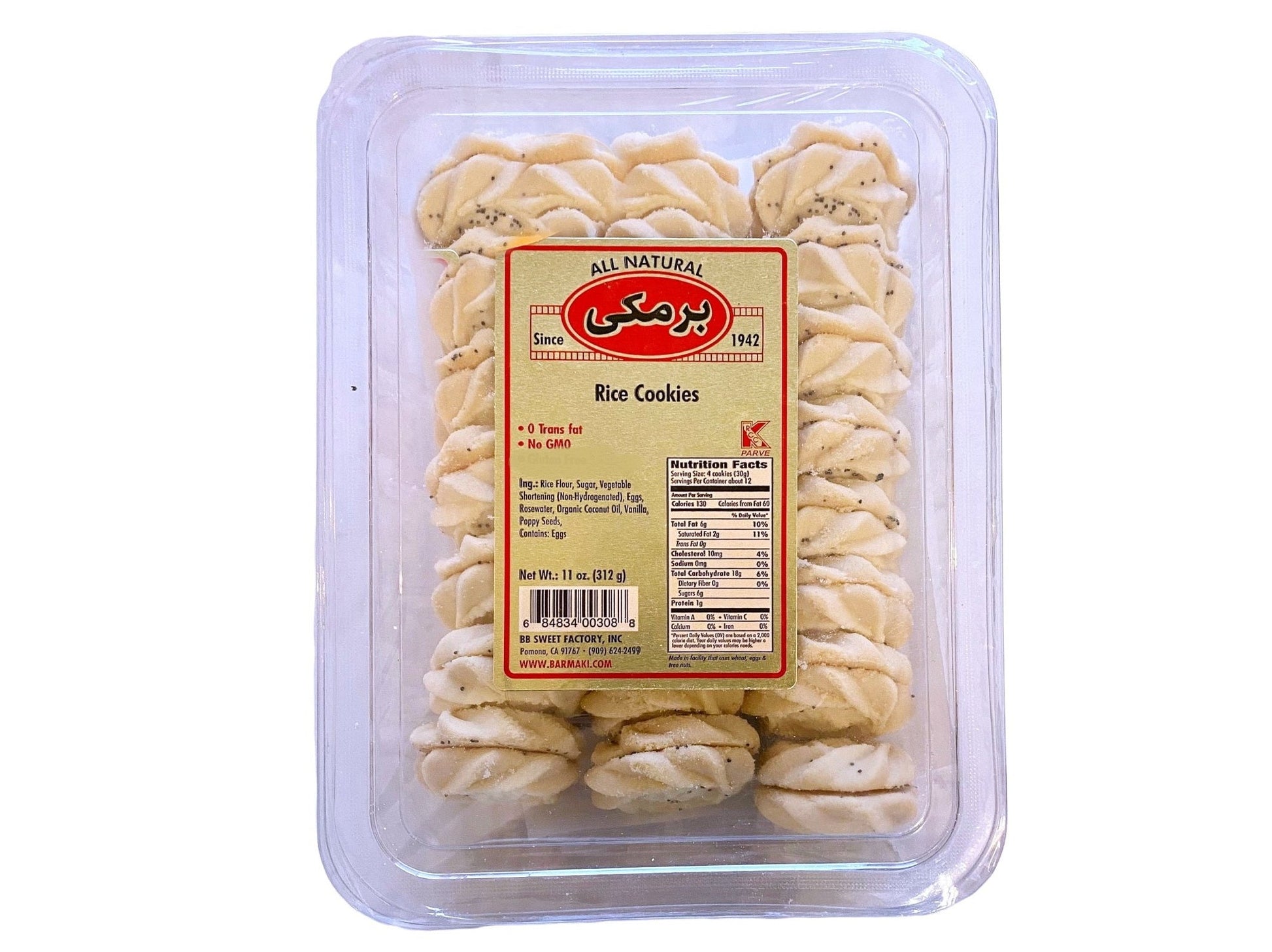 Ing.: Rice Flour, Sugar, Vegetable Shortening (Non.Hydrogenated), Wheat Flour, Eggs, Rosewater, Organic Coconut Oil, Vanilla, Poppy Seeds
