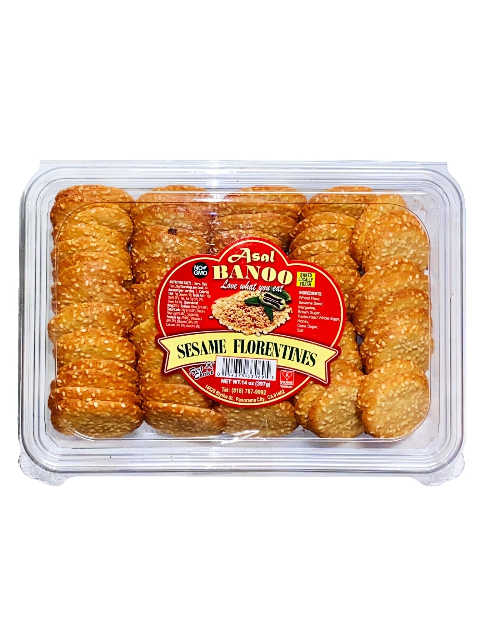 Ingredients: Wheat four, Sesame seeds, Margarine, Brown Sugar, Pasteurized whole Eggs, Honey, Cane Sugar, Salt